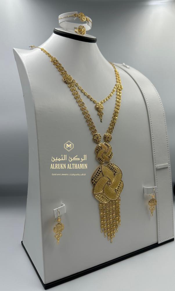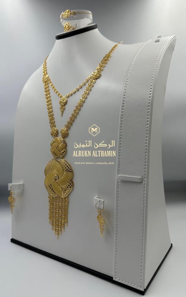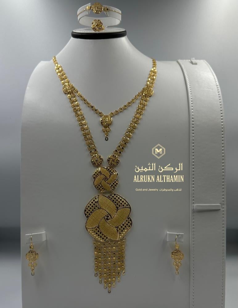 ارتقي بإطلالتك مع طقم ذهب عيار ٢١ المميز، والمصمم خصيصًا ليعكس الفخامة والرقي في كل تفصيلة هذا الطقم الملكي عيار 21 مصنوع من ذهب صافي يضفي لمسة ملكية آسرة ويمنحك حضورًا لافتًا في كل مناسبة، سواء كانت خطوبة، زفاف، أو هدية فاخرة.